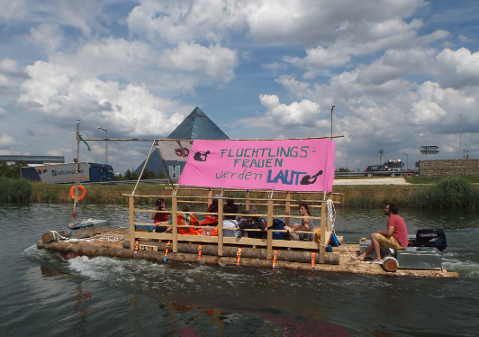 - Wir organisieren Demonstrationen und andere Aktionen, um Öffentlichkeit zu schaffen und EntscheidungsträgerInnen mit den Anliegen von asylsuchenden Frauen zu konfrontieren. Zum Beispiel haben wir im Sommer 2014 Deutschland auf Flößen durchquert. Auch Flüchtlingsfrauen aus anderen Bundesländern waren dabei. Und für die, die mitmachen konnten, war es eine neue, oft überwältigende Erfahrung, mit so vielen Frauen zusammen zu kämpfen, gemeinsam täglich die kleinen und großen Probleme zu lösen, gemeinsam Solidarität zu erfahren und zu schaffen – gegen die oft viele Jahre dauernde Isolation und Ungewissheit in den Lagern.